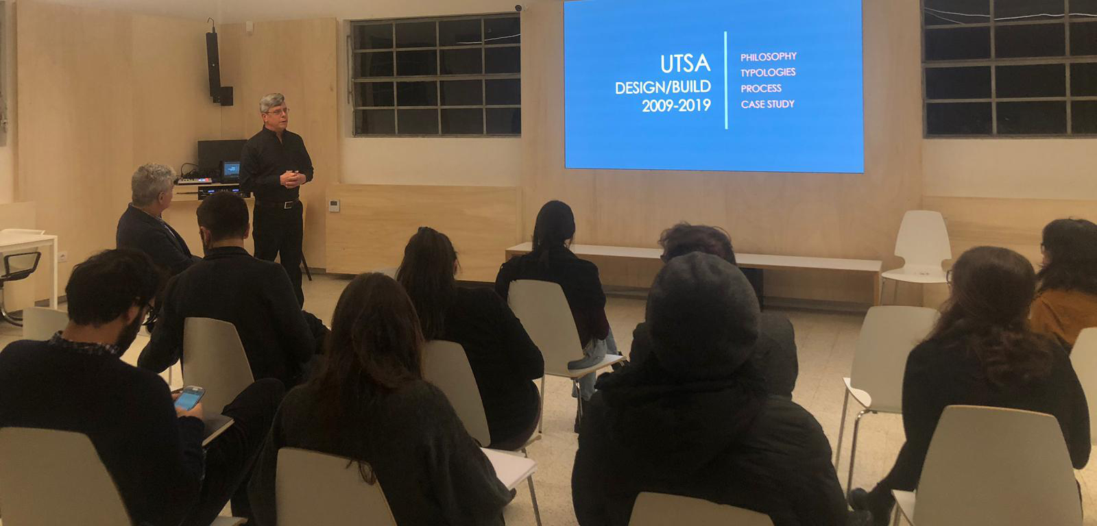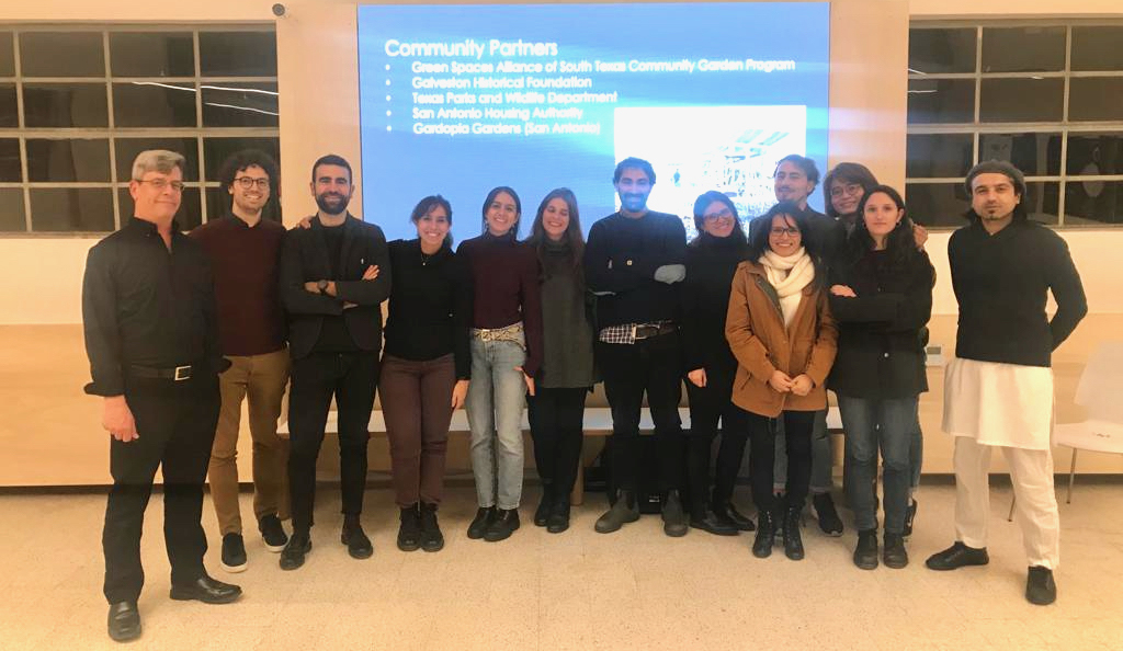 (November 25, 2019) — On November 22, UTSA CACP adjunct instructor Darryl Ohlenbusch, AIA, presented a lecture on the work of his Design/Build Studios at the School of Sustainability (SOS) in Bologna, Italy, a graduate school of architecture founded by architect Mario Cucinella. Prior to the lecture, Ohlenbusch participated in a design review of the current graduate students’ projects relating to global trends in architecture and sustainability.
