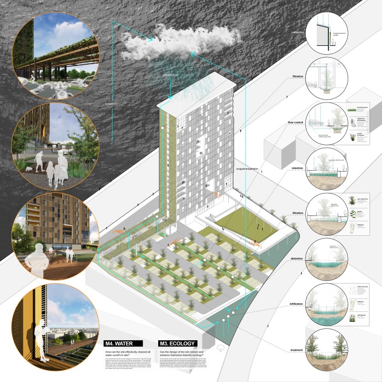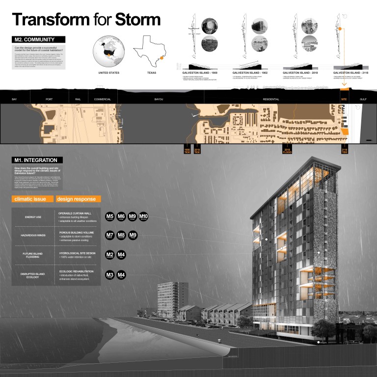 “Transform for Storm” responds to the proposed site of Galveston, Texas, location of the deadliest natural disaster in U.S. history. Before the Storm of 1900, Galveston was a bustling port city on the Gulf Coast and the center of cotton trade in Texas. When the storm hit land, it flooded the island and killed about one-fifth of the island population. Galveston would eventually rebuild the lost urban fabric and construct a ten-mile long and seventeen-foot-high seawall to protect the island’s southern exposure. It is on this seawall where the students’ proposed eco-hotel sits.