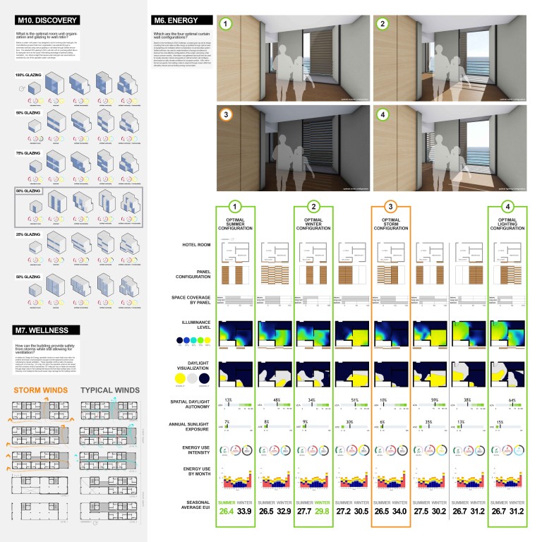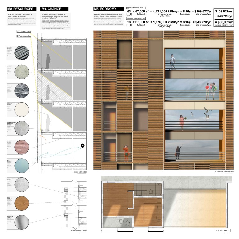 The city never regained its position as a preeminent port of entry for the southern U.S., having to diversify its economy through tourism, health care, finance, and education. Despite Galveston’s physical recovery, the reality of life in Galveston continues to be defined by the precarious geography and fragile ecology of the barrier island. This project aspires to remember the past while confidently and creatively imagining the future, mediating Galveston’s environmental circumstances through efficiency, adaptability, and resilience. In designing this eco-hotel, Simon and Ventura aim to create an architecture that attends to the challenging humid, subtropical climate; weathers the increasingly severe storms that roll in from the Gulf; redefines the program, function, and image of twenty-first century leisure; achieves a powerful and refined architectural expression using limited material resources; and makes residents feel safe.