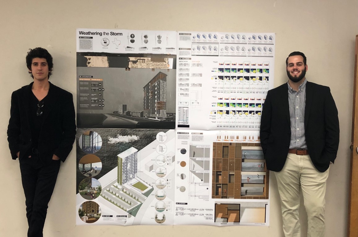 (November 20, 2019) — University of Texas at San Antonio (UTSA) architecture students Andre Simon and Ivan Ventura are the winners of the AIA San Antonio 2019 Student Design Award for “Transform for Storm,” their proposal for an eco-hotel in Galveston, Texas that responds to the extreme environmental circumstances that define the coastal city. Their winning proposal was selected from a very competitive field of entries by the AIA San Antonio 2019 Design Award Committee. Simon and Ventura were honored by AIA San Antonio during the annual People + Place Awards Celebration, held on November 19, 2019 at the McNay Art Museum.