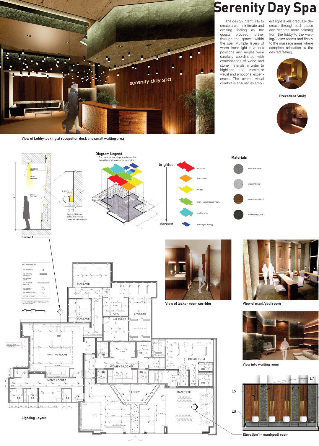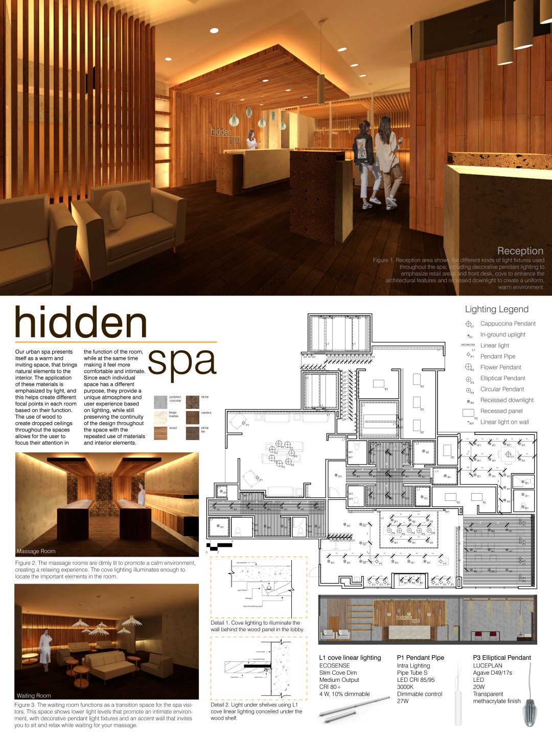 This year, a student team of Melissa Santos Romo, Clarissa Perez, and Yanely Mireles Garza received the first place award with a scholarship of $2,000 for their project “Hidden Spa.” Another team of John R. Franklin, Esmirna Moya, and Danny J. Gonzalez received two awards: the fifth place award and Owner’s choice award with a total of $1,000 scholarship for the project “Serenity Day Spa.” Both projects were completed under UTSA College of Architecture Construction and Planning assistant professor Dr. Jae Yong Suk in the Architectural Lighting Design course offered in the Spring 2019 semester. The two winning projects are shown below.